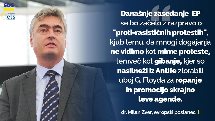 Zasedanje se bo sicer začelo z razpravo z naslovom "proti-rasistični protesti ob smrti Georgea Floyda v ZDA". Žal mi je, da je sestava konference predsednikov Evropskega parlamenta taka, da se razprava že z naslovom naklonjeno opredeli do kontroverznega dogajanja. Mnogi ga ne vidimo kot "mirne proti-rasistične proteste", temveč kot gibanje, ki ga zaznamujejo ropanje, sežiganje in podobno. Uboj Georga Floyda je nasilnežem iz Antife dal povod, da so pod parolo boja proti rasizmu dobili še dodaten spin za teror in sovraštvo.