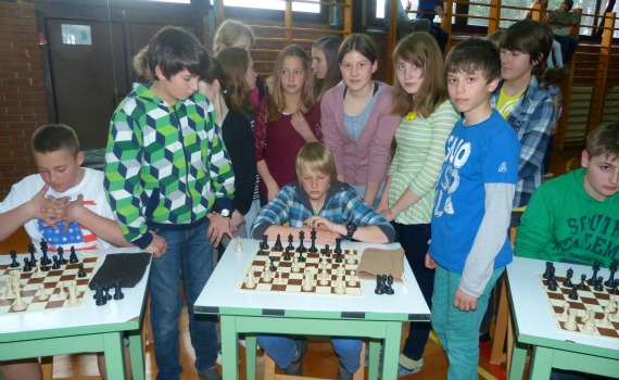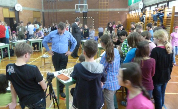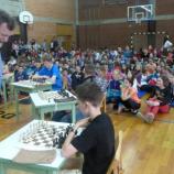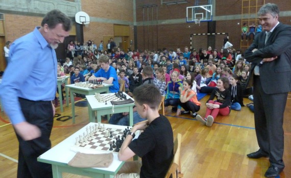 Dr. Zver je nato Osnovni šoli prof. dr. Josipa Plemlja Bled predal 15 šahovskih garnitur na katerih so učenci odigrali simultanko z mednarodnim šahovskim mojstrom Vojkom Mencingerjem.