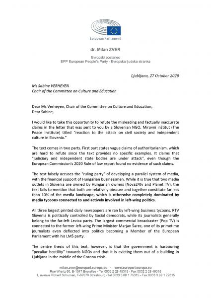 Evropski poslanec dr. Milan Zver je predsedujoči odbora za kulturo in izobraževanje v Evropskem parlamentu Sabine Verheyen, poslal pismo, v kateri se je odzval na zavajajoče in netočne navedbe Mirovnega inštituta in nekaterih nevladnih organizacij v zvezi z njihovimi očitki o napadih na civilno družbo in neodvisno kulturo v Sloveniji.