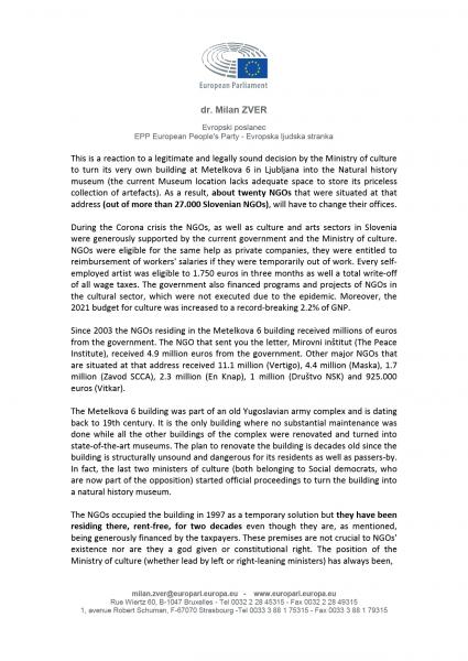 Evropski poslanec je v pismu tudi opozoril, da Mirovni inštitut skupaj z 20 nevladnimi organizacijami (v Sloveniji sicer deluje preko 27.000 nevladnih organizacij) lažno navaja, da jih skuša ministrstvo za kulturo izseliti iz njihovih prostorov na Metelkovi 6. Dr. Milan Zver je v pismu predsedujoči odboru CULT opozoril, da omenjene nevladne organizacije vse od leta 1997 zasedajo prostore na lokaciji ministrstva, in to brez plačila najemnine, obenem pa omenjene organizacije, ki v tujini lažnivo blatijo ministrstvo za kulturo in slovensko vlado, od vlade prejemajo ogromna finančna sredstva za svoje delovanje.
