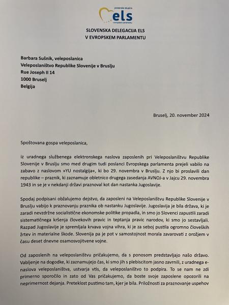 Slovenska delegacija pri Evropski ljudski stranki je na veleposlanico Republike Slovenije v Bruslju Barbaro Sušnik naslovila pismo, v katerem obžalujejo, da zaposleni na veleposlaništvu vabijo na dogodek v Bruslju ob nastanku Jugoslavije. "Država je razpadla zaradi nevzdržnih socialističnih gospodarskih politik, Slovenci pa smo jo zapustili zaradi sistematičnega kršenja človekovih pravic in teptanja pravic narodov," je zapisano v pismu. Evropski poslanci od veleposlanice Sušnikove pričakujejo, da bo zaposlene opozorila na neprimernost dejanja.
